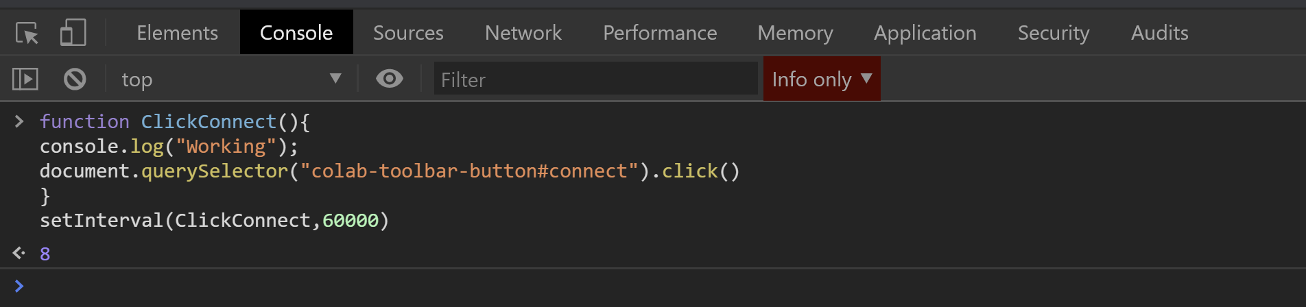 setInterval(ClickConnect,60000)