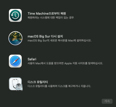맥북 부팅시, 아래 키를 누르고 있으면 매뉴가 나타남.